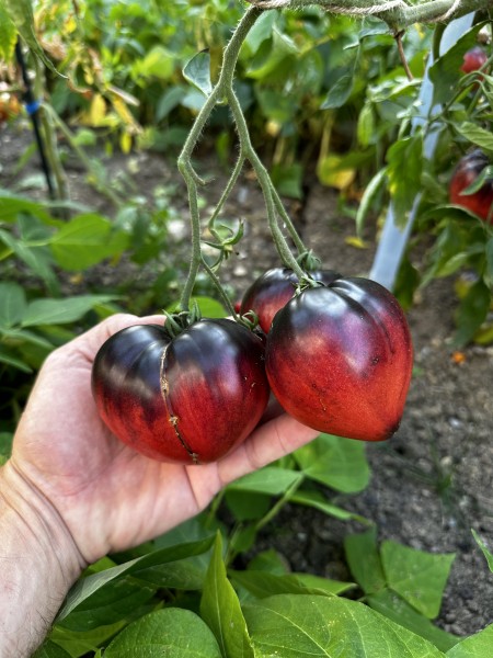 Les fruits, de calibre moyen, pèsent entre 150 et 300 grammes. Ils présentent une forme cœur légèrement côtelée, avec une peau rose striée de bleu et une épaule anthocyanin foncée, qui devient presque noire à maturité. La chair est dense, charnue, avec peu de graines, offrant une texture agréable en bouche.