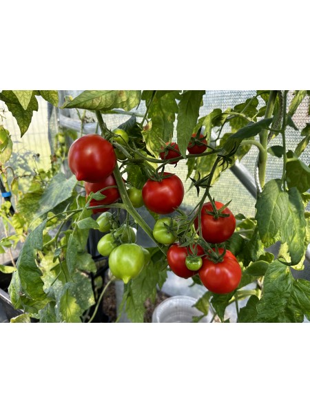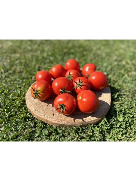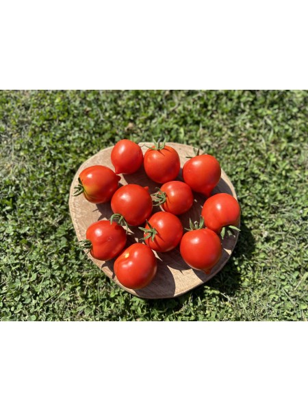 Les fruits, de petit calibre, sont de couleur rouge écarlate et présentent une forme ovale avec un petit téton caractéristique. Ils sont portés en grappes abondantes, ce qui en fait une variété idéale pour les cultures familiales ou les petits jardins. La chair est douce, parfumée et légèrement farineuse, offrant une saveur agréable sans acidité prononcée. Ces tomates sont particulièrement appréciées pour les apéritifs ou en salade.