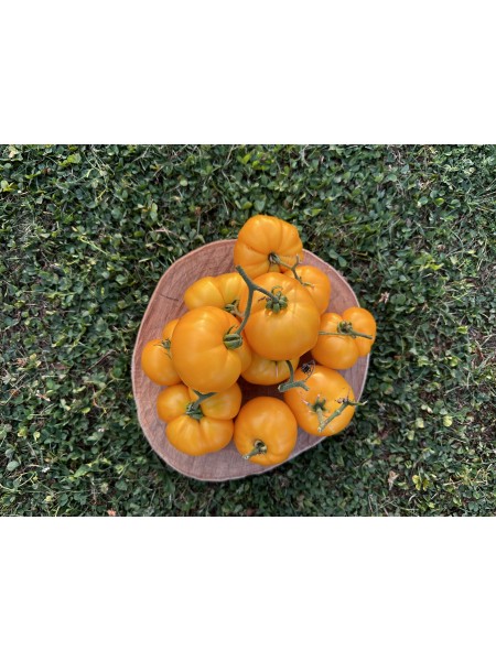 La tomate Marmande Jaune est une variété française ancienne, reconnue pour sa saveur douce et sa chair juteuse. Ses fruits, de couleur jaune vif, pèsent entre 100 et 180 grammes. Ils présentent une forme légèrement aplatie, avec des côtes marquées sur la partie supérieure. Ces tomates se forment en bouquets compacts de 5 à 6 fruits, chacun présentant une dépression modérée à l'attache pédonculaire et une légère trace d'ombilic.