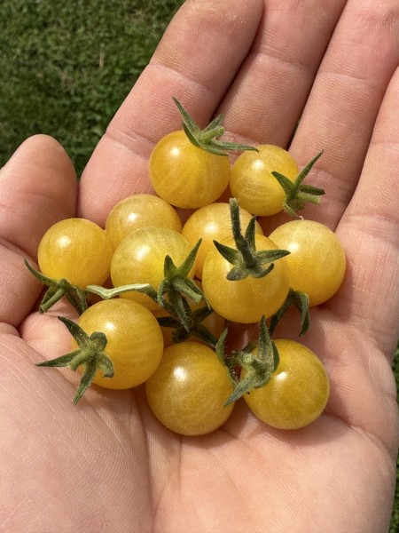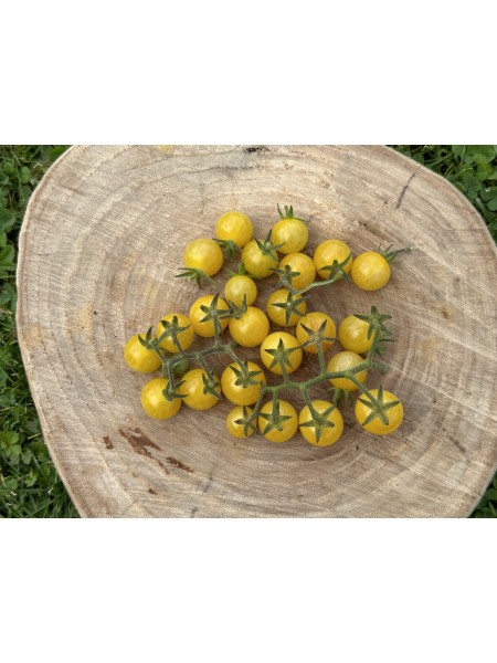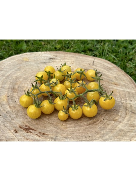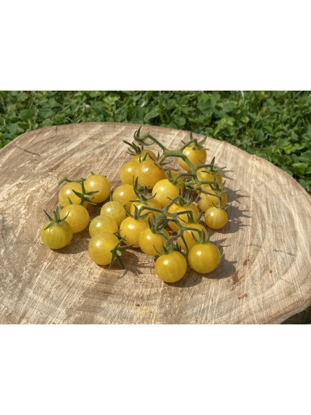 Les fruits, de type cerise et de calibre très petit (environ 1,5 cm de diamètre), sont de couleur jaune pâle translucide, presque ivoire, et possèdent une saveur sucrée et fruitée bien marquée. Chaque grappe peut contenir de 6 à 8 fruits, et un seul plant peut produire des centaines, voire des milliers de tomates, offrant ainsi une récolte abondante.