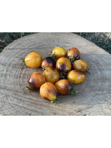 La tomate Atomic Sunset est une variété mi-saison, issue du croisement entre Brad’s Atomic Grape et Roma Orange, développée par Brad Gates aux États-Unis. Elle se distingue par sa forme allongée de type prune, d’un calibre de 20 à 40 grammes, et sa couleur orange éclatante marbrée de traces d’anthocyanines, notamment au niveau des épaules, qui peuvent devenir presque noires sous une exposition solaire intense.