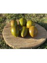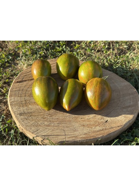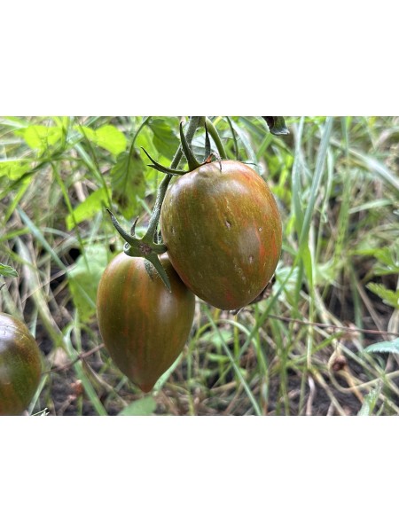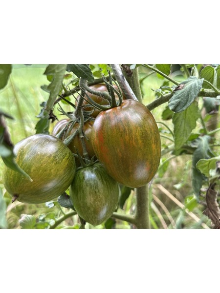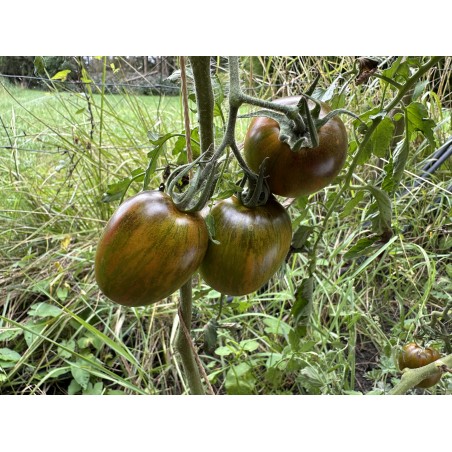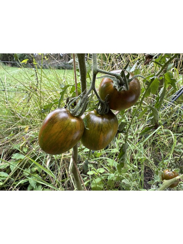 La tomate Brad's Atomic Grape est une variété originale et spectaculaire, développée par le créateur américain Brad Gates. Cette tomate indéterminée se distingue par ses grappes de fruits allongés, de calibre petit à moyen, qui présentent une palette de couleurs fascinante. Les fruits immatures arborent des teintes lavande et violettes, évoluant vers un mélange de vert, rouge, marron et bleu anthocyanine à maturité. À l'intérieur, la chair est verte, marbrée de rouge, offrant une saveur délicatement sucrée.