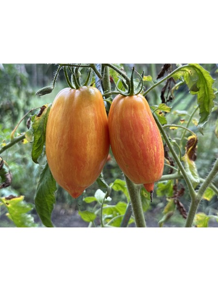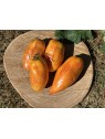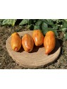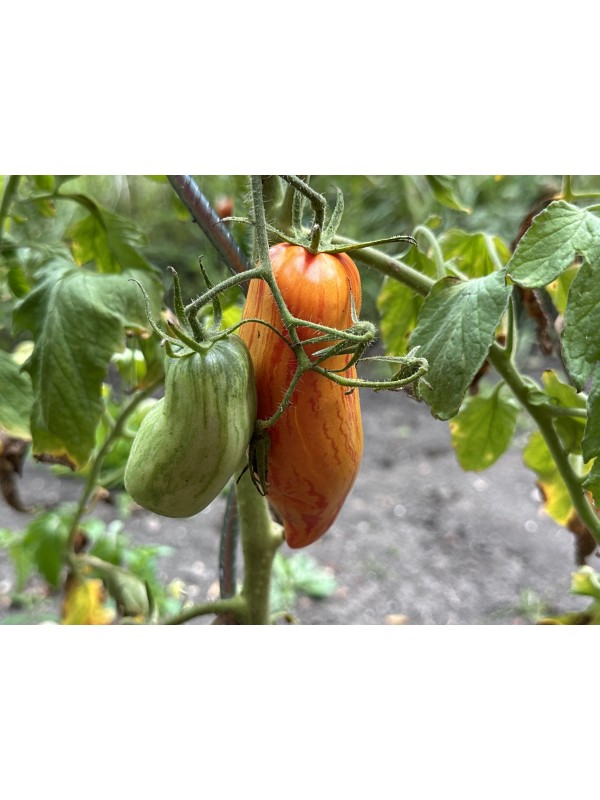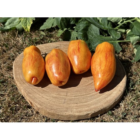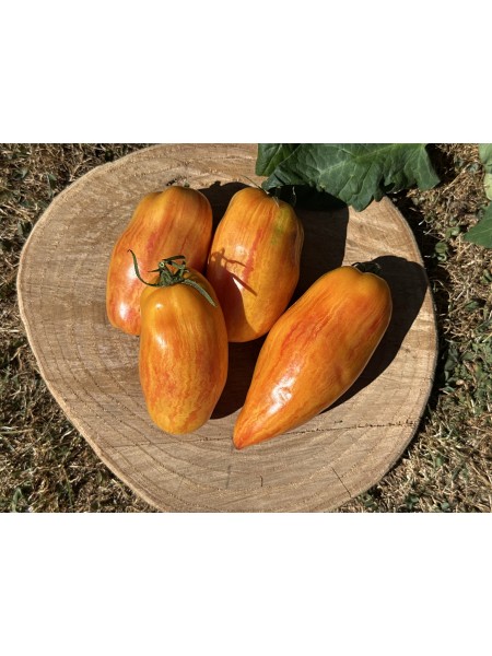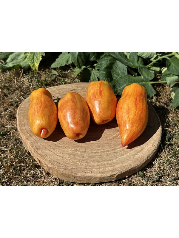 La tomate Yellow Fire est une variété de type Roma, reconnue pour sa forme allongée, légèrement ventrue, se terminant par une pointe souvent invaginée. Ses fruits, pesant entre 120 et 200 grammes, arborent une peau marbrée aux teintes rouge, jaune et orange, évoquant les couleurs d'un feu. Sa chair est dense, charnue et peu aqueuse, idéale pour la préparation de sauces ou pour la mise en conserve. Elle peut également être consommée crue, offrant une saveur sucrée et fruitée supérieure à d'autres variétés de type Roma.