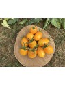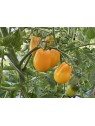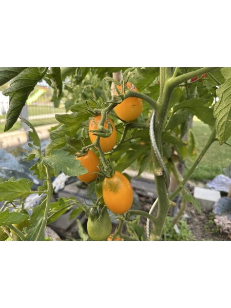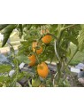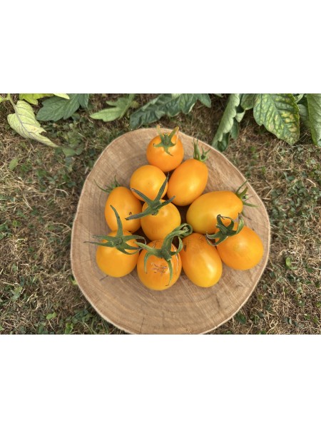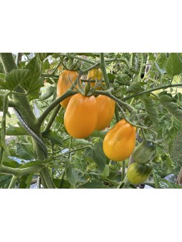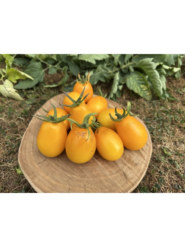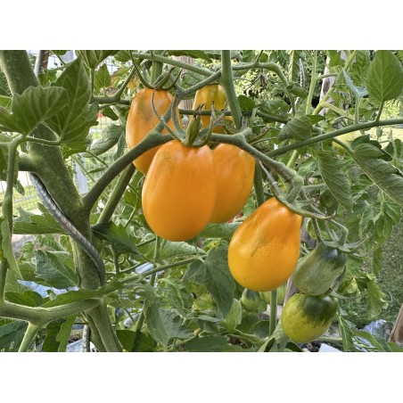 Les fruits, d'un jaune éclatant, présentent une forme ovale à piriforme (en poire) et pèsent environ 35 à 50 grammes. Ils sont souvent regroupés en bouquets de 8 à 10 fruits, ce qui les rend particulièrement attrayants pour les amateurs de tomates anciennes.