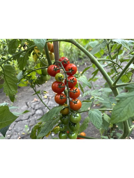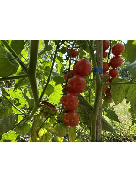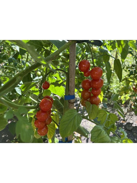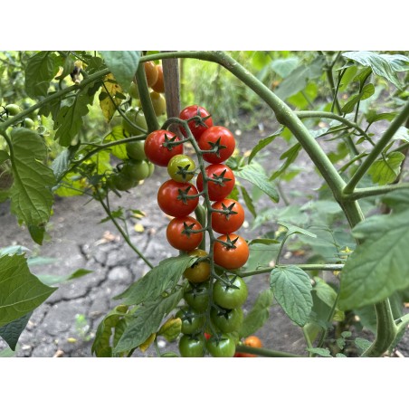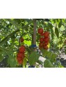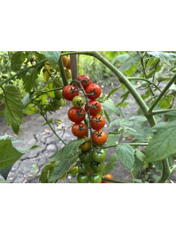 La Juanita est une tomate cerise de calibre cerise d’un rouge profond éclatant, à la forme ronde parfaitement régulière. Le plant, de type indéterminé, présente un port vigoureux et généreux : il produit de nombreuses grappes par tige, avec une bonne tolérance aux fissures. Le poids moyen du fruit se situe entre 10 et 15 grammes, ce qui la place parmi les cerises de taille fine.
