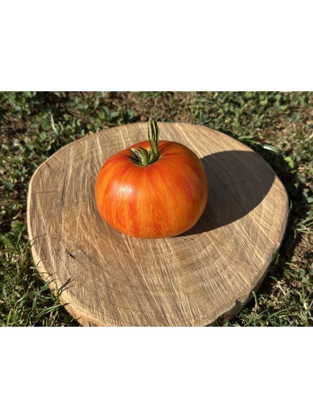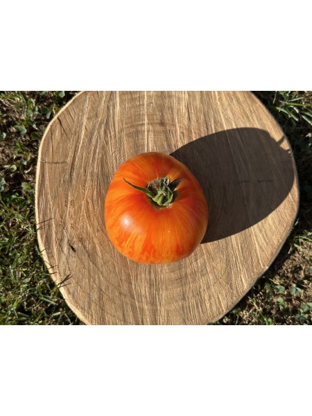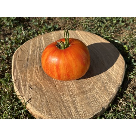 Les fruits, de calibre gros (200 à 400 g), sont de forme ronde légèrement aplatie, parfois légèrement côtelés. Leur couleur est particulièrement remarquable : un épiderme zébré mêlant jaune et orangé, avec des marbrures subtiles et un aspect bigarré. À l’intérieur, la chair est dense, juteuse et aromatique, avec un goût fruité bien équilibré, souvent décrit comme agréablement sucré avec une pointe d’acidité.