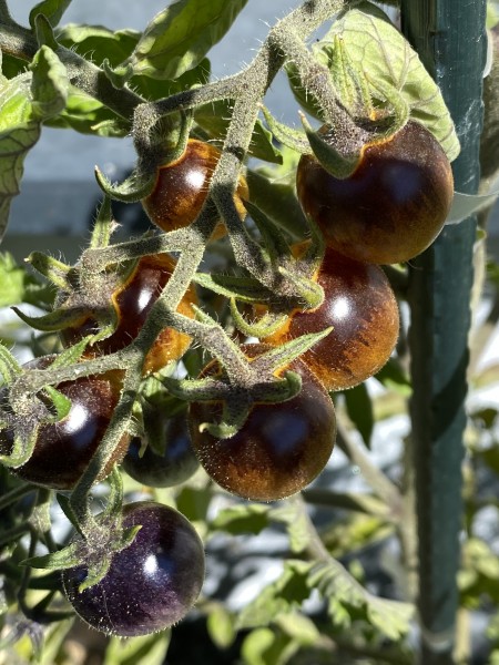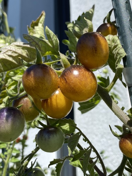 La tomate Antho Gelb est une variété de tomate cerise remarquable par son apparence et son goût. Ses fruits, de calibre moyen, présentent une peau jaune pâle ornée de reflets anthocyaniques violacés sur le sommet, créant un contraste visuel saisissant. Cette coloration unique est due à la présence d'anthocyanines, des pigments naturels aux propriétés antioxydantes.