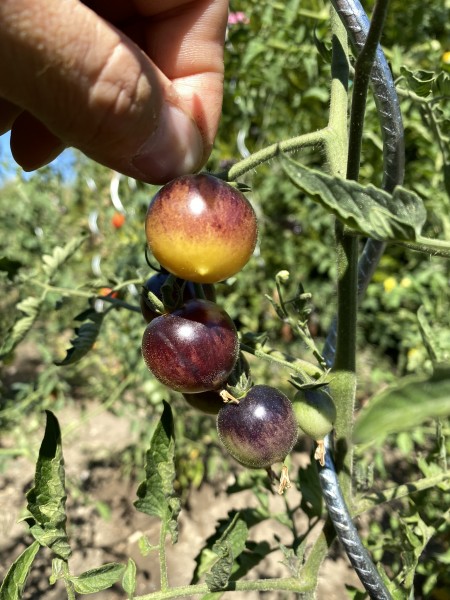 La tomate Bleu Feu est une variété hybride remarquable, issue des croisements réalisés par Tom Wagner. Elle se distingue par sa peau d'un bleu profond, presque noir, qui évolue vers des nuances rougeâtres et orangées à maturité, parsemées de taches dorées. Cette coloration unique est due à la présence d'anthocyanines, des pigments antioxydants également retrouvés dans les myrtilles ou le raisin.