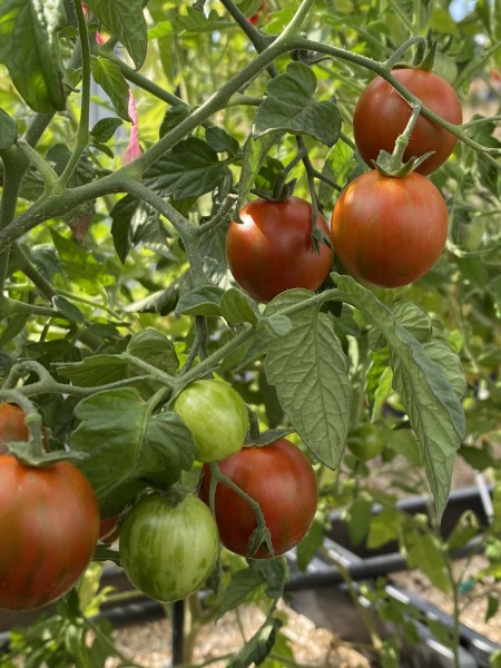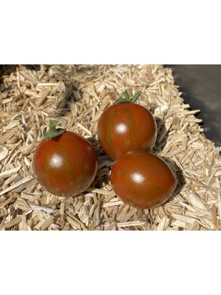 La Tomate Cerise Noire Tigrée est une variété de tomate cerise de type indéterminé, appréciée pour ses fruits au calibre moyen, pesant entre 20 et 25 grammes. Sa peau, d'un pourpre très sombre, presque noir, est ornée de subtiles stries vertes, conférant à cette variété un aspect unique et décoratif. La chair, d'un brun profond, est juteuse et offre un goût sucré, équilibré et légèrement fumé, idéal pour les amateurs de saveurs originales.