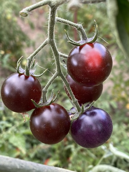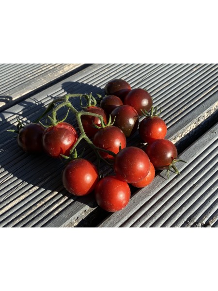 La tomate Fahrenheit Blues est une variété de tomate cerise mi-saison, développée par le célèbre semencier américain Tom Wagner. Elle se distingue par ses fruits ronds de calibre cerise, mesurant environ 2 à 3 cm de diamètre, qui mûrissent en grappes de 8 à 16 unités. À maturité, les fruits adoptent une couleur bleu foncé sur le dessus, avec une teinte rougeâtre en dessous, particulièrement accentuée lorsque les tomates sont exposées à une forte luminosité. Cette coloration est due à la présence d'anthocyanines, des antioxydants puissants bénéfiques pour la santé.
