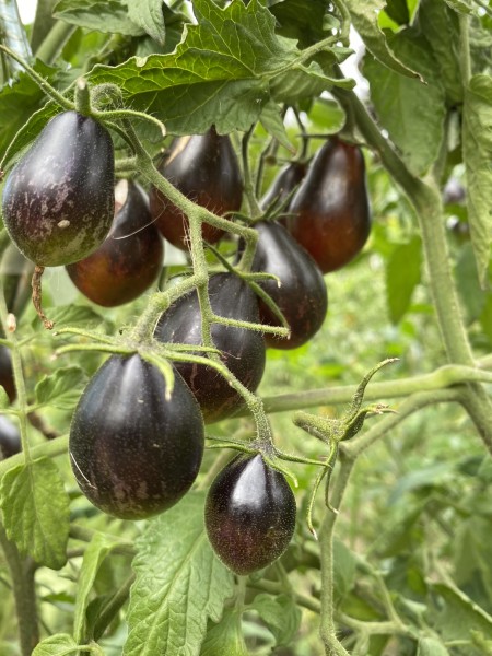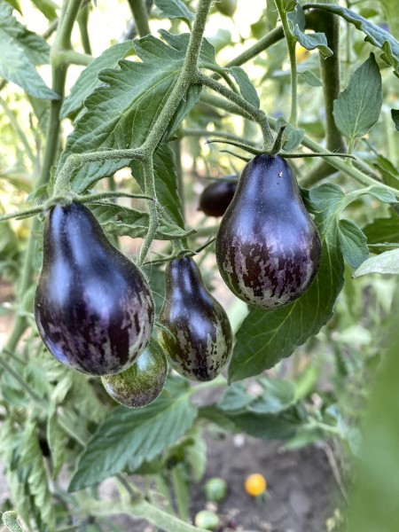 La tomate Blue Keyes est une variété de tomate cerise à la forme poire, développée par Dean Slater aux États-Unis en hommage à son ami le révérend Michael Keyes. Cette variété indéterminée se distingue par ses fruits multicolores d'environ 20 à 25 grammes, présentant une palette de couleurs allant du bleu, violet, rouge, orange au jaune, avec des nuances dorées et des taches étoilées. Sa chair rouge, juteuse et sucrée offre une saveur douce et légèrement acidulée, idéale pour la consommation crue, en salade ou en apéritif.
