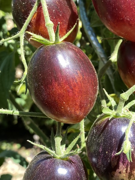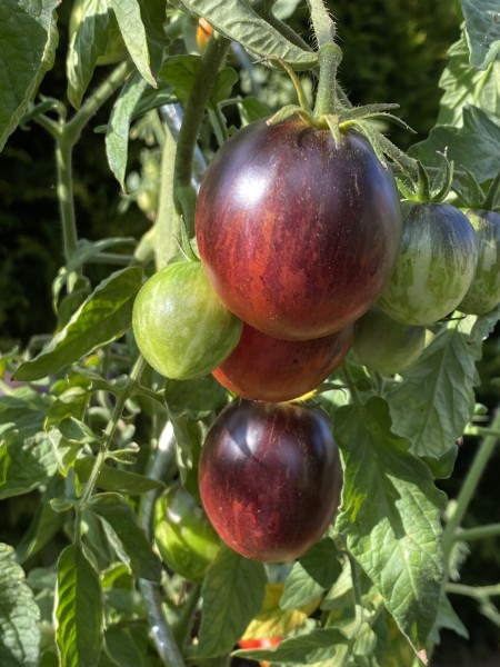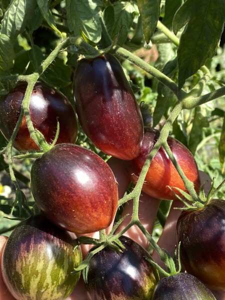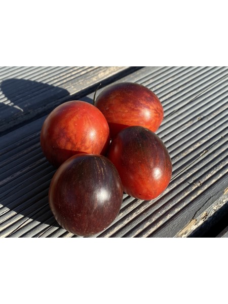 La tomate Damascus Steel est une variété héritage américaine développée par Dean Slater. Issue d'un croisement entre la Purple Dragon et la Striped Sweetheart, elle se distingue par son apparence saisissante et son goût unique. Les fruits, de forme ronde à légèrement oblongue, pèsent entre 80 et 120 grammes. Leur peau présente une palette de couleurs allant du pourpre au rouge, avec des nuances de bleu, orange et vert, et des traces d'anthocyanines sur les épaules. Cette pigmentation particulière est le résultat de la présence d'anthocyanines, des pigments naturels aux propriétés antioxydantes.