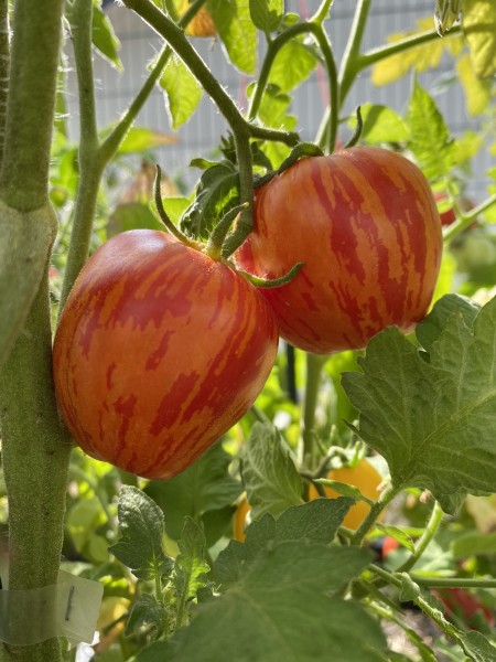 La tomate Elberta Girl est une variété héritage originaire des États-Unis, développée par Tom Wagner et introduite en 1983. Elle est reconnue pour sa peau légèrement duveteuse, évoquant celle du pêche Elberta, d'où son nom. Les fruits, de taille moyenne, présentent une forme légèrement allongée et sont caractérisés par une peau rouge vif marbrée de jaune doré, offrant un contraste saisissant. Chaque tomate pèse environ 95 g.