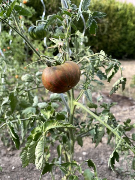 Les fruits sont de taille moyenne, pesant entre 150 et 300 g, de forme ronde et légèrement aplatie, avec des épaules parfois côtelées. À maturité, leur peau présente une couleur rouge lie de vin striée de vert bronze, créant un contraste saisissant. La chair est dense, tricolore et foncée, offrant une saveur zestée, douce et légèrement acidulée, typique des tomates de type beefsteak.