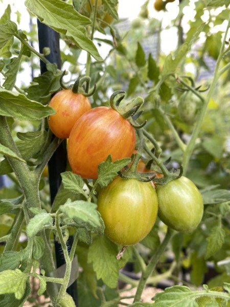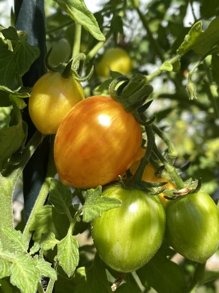 La tomate ARTISAN™ Sunrise Bumble Bee est une variété de type cerise à croissance indéterminée, issue de la collection Artisan™. Elle se distingue par sa couleur jaune vif marbrée de rouge et de rose, offrant un aspect visuel aussi attrayant que son goût. Les fruits, d'un calibre d'environ 1,5 cm, pèsent entre 20 et 25 grammes et présentent une forme oblongue caractéristique. Leur saveur est douce, sucrée et légèrement acidulée, idéale pour les salades, les salsas ou la consommation en frais.