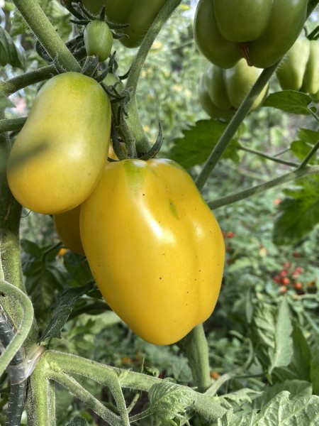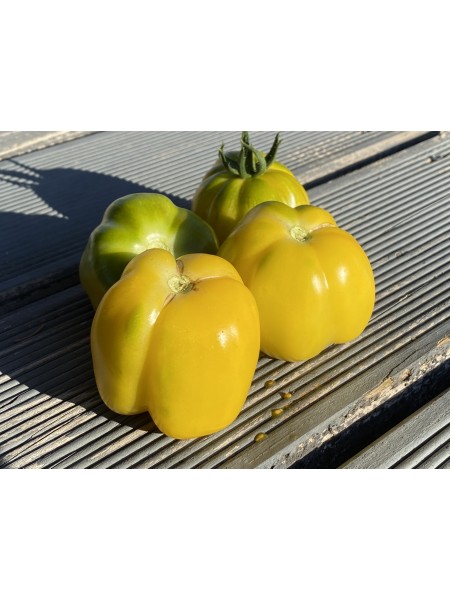 La tomate Doochova Yellow Pepper est une variété ancienne originaire de Russie, transmise par Ruslan Doochov, un cultivateur ukrainien de quatrième génération. Ce fruit rare se distingue par sa forme carrée à 3 ou 4 lobes, évoquant celle d'un poivron, et sa couleur jaune pâle à jaune crème. Chaque tomate pèse entre 120 et 200 g, offrant une chair ferme et épaisse, presque sans gel, avec peu de graines. Sa texture « sèche » en fait une candidate idéale pour le farci, mais elle peut également être consommée crue en salade.