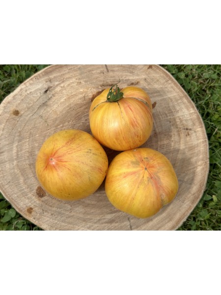 La peau, d'un dégradé de jaune orangé zébré de rouge/rosé, est plus marquée sur la partie supérieure, avec des traces vertes aux épaules. La chair, juteuse et sucrée, est d'un jaune orangé veiné de rose, offrant une saveur exceptionnelle, comparable aux meilleures variétés bicolores.