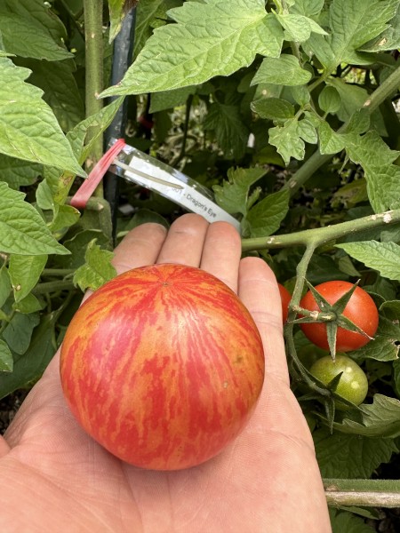 La tomate Dragon's Eye est une variété hybride récente, développée par Brad Gates de Wild Boar Farms aux États-Unis. Cette variété se distingue par sa précocité, sa productivité élevée et son port indéterminé. Elle est particulièrement adaptée aux climats variés, offrant une récolte fiable même en conditions fraîches.